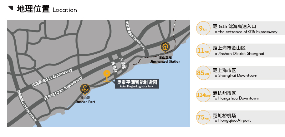 Aotai Pinghu Logistics Park is strategically located in Dushan Port, Jiaxing, only 11km frorn ShanghaiJinshan Distict and85km from the Shanghai CBD with the established infrastructure providing excelent connectivity to Chind's prernierconsumption and economic hub.