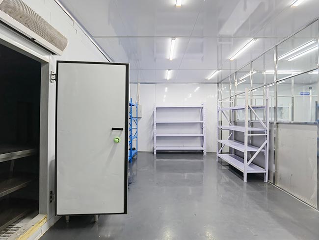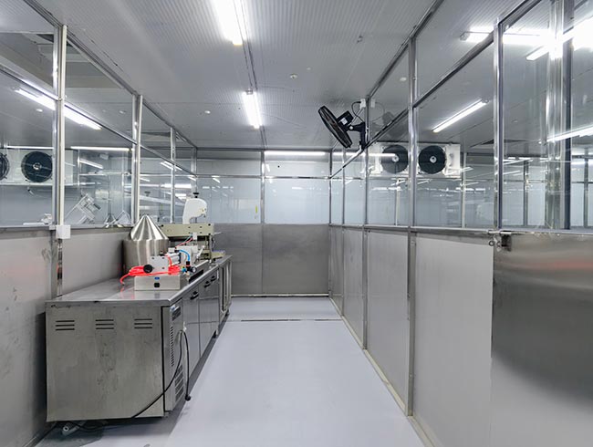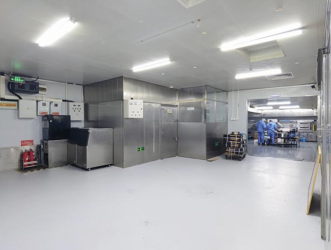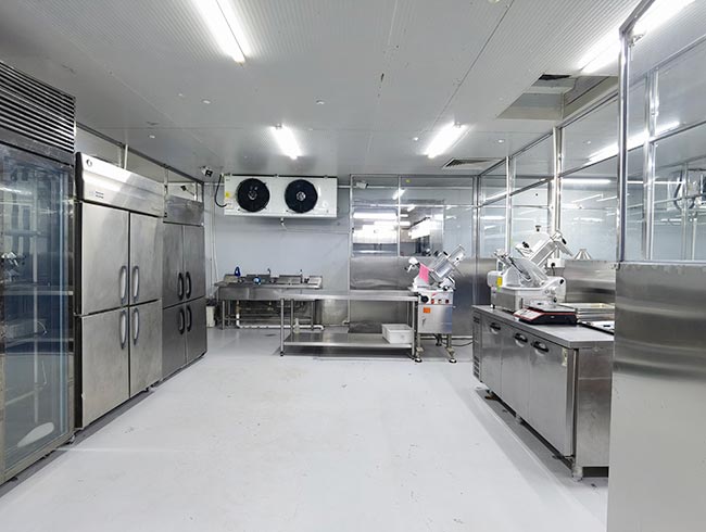 车间位于二层,总面积850㎡,配有3个冷库共150㎡,冷热加工车间、设备区、消毒清洗区、仓储区、更衣间等功能分区齐全,水电、橱柜、消防等配套完善。