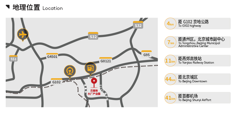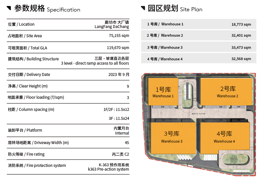 贝莱特大厂产业园距离北京中心城区44公里,拥有完善的基础设施﹐为华北区域经济和消费中心提供了极佳的连接性。该项目预计于2023年第3季度完工,届时可提供近120,000平方米可用于工业或物流的高标准优质空间。