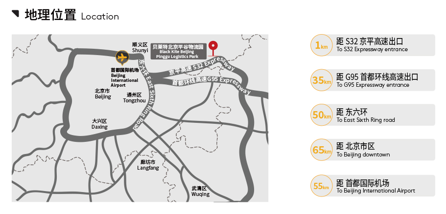 Black Kite Dachang Industrial Park is strategically located 44 kilometres from Beijing downtown and benefits from established infrastructure providing excellent connectivity to the economic and consumer hub of Greater Beijing. On completion in Q3 2023, Black Kite Dachang Industrial Park will provide 120,000 sqm of Grade A modern warehouse and industrial space for businesses seeking quality premises for their operations.