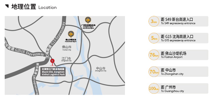 Black Kite Jiangmen Xinhui Logistics Park is a prermium Grade A logistics development located in the western side of thePearl River Delta economic zone connecting to core cities including Guangzhou,Foshan, Zhongshan, Zhuhai andHengqin New Area. The development has excellent connectivity with access to expressways including expressways suchas S2518/G15/S49.