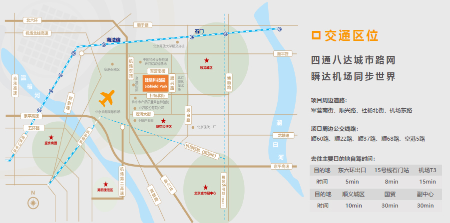 交通:距离地铁15号线石门站3km,多条公交车直达园区门口,园区紧临东六环,机场北线,顺平路,通顺路。路网四通八达可快速到达市区和城市副中心。