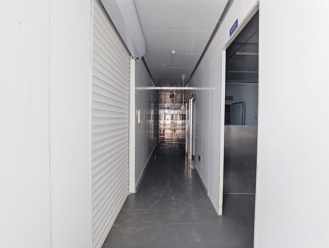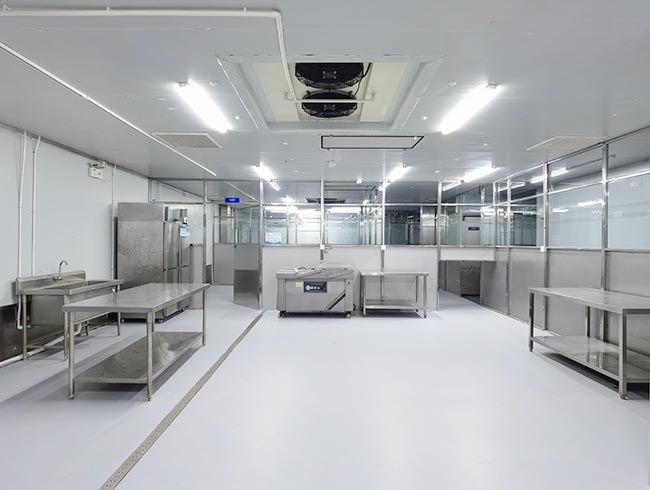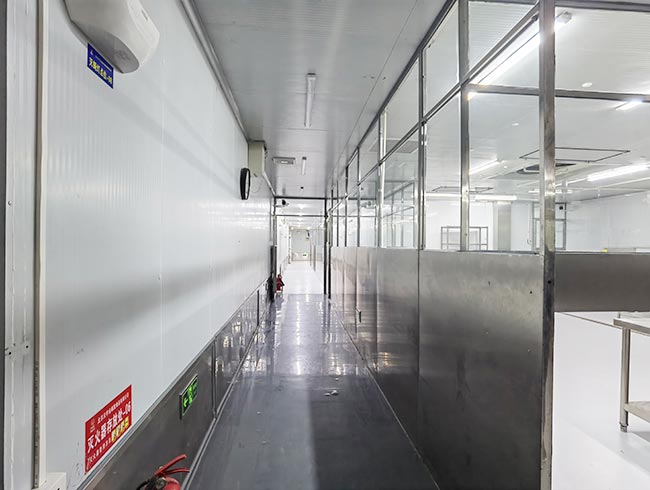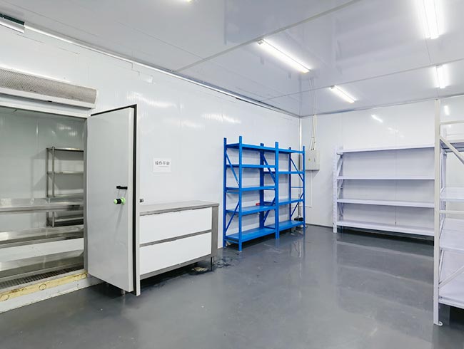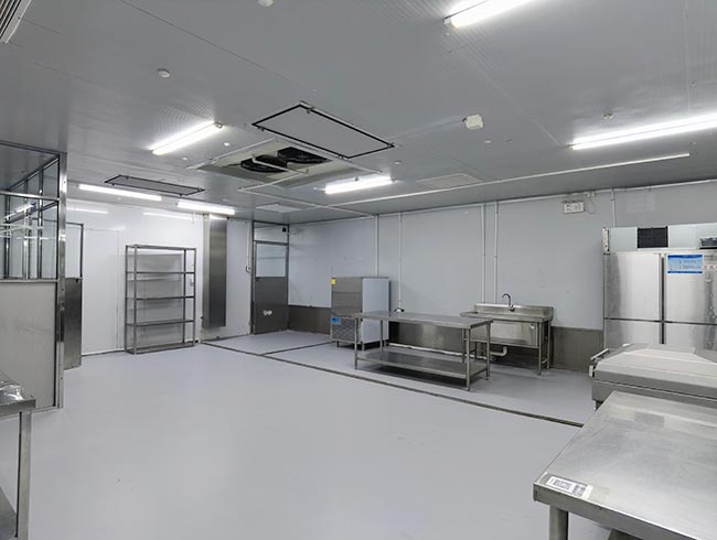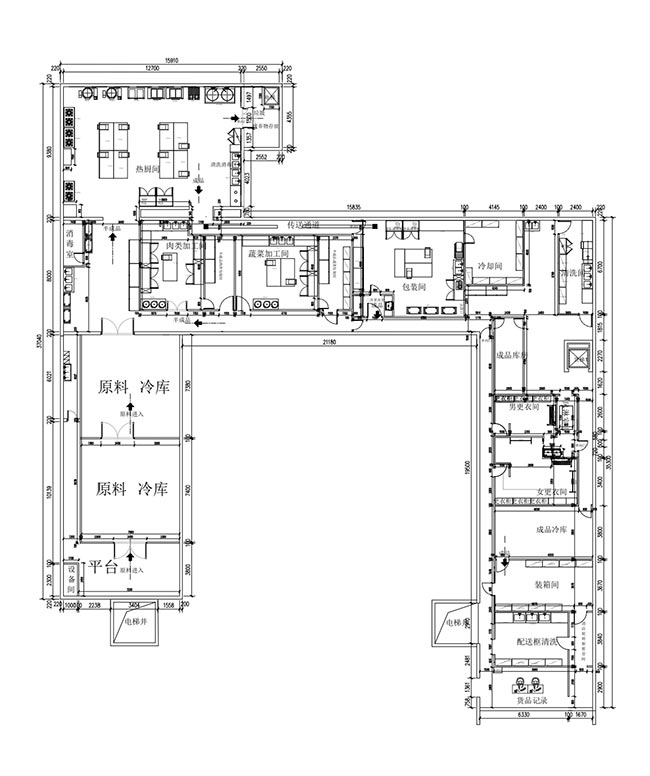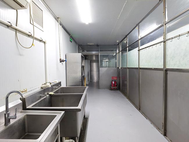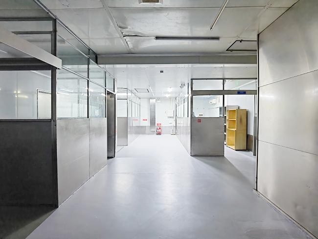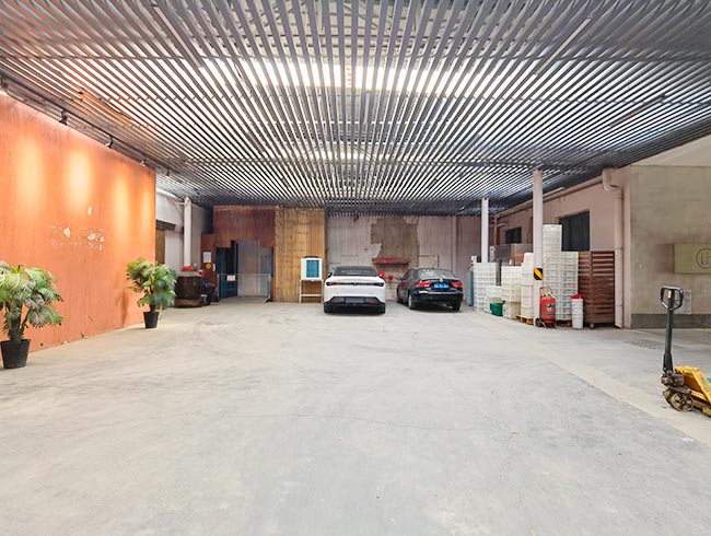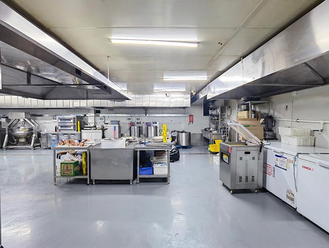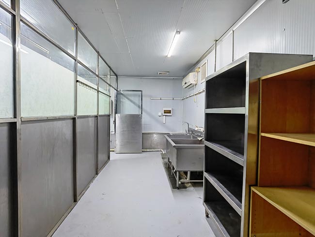 车间位于二层,总面积850㎡,配有3个冷库共150㎡,冷热加工车间、设备区、消毒清洗区、仓储区、更衣间等功能分区齐全,水电、橱柜、消防等配套完善。