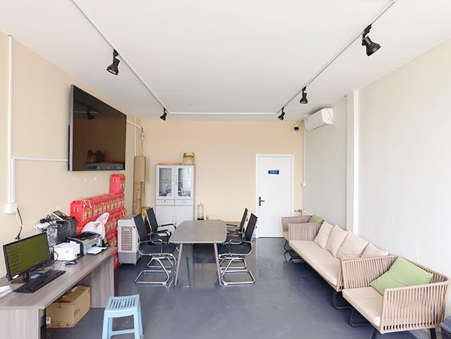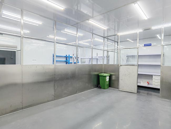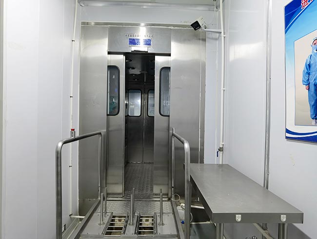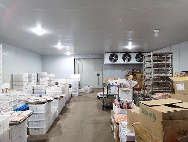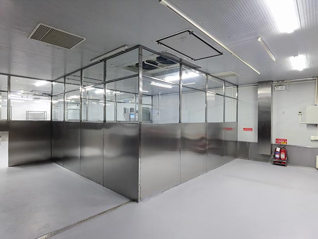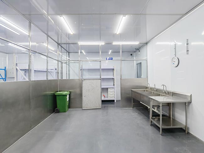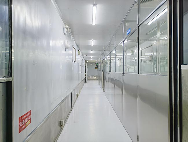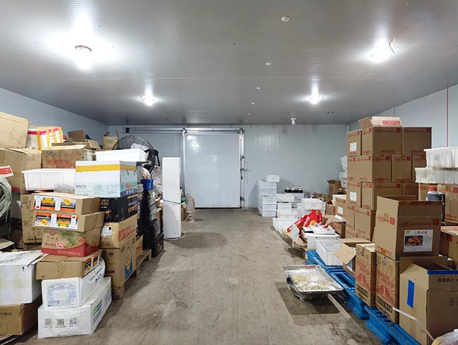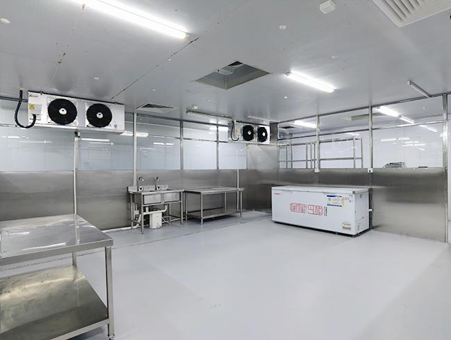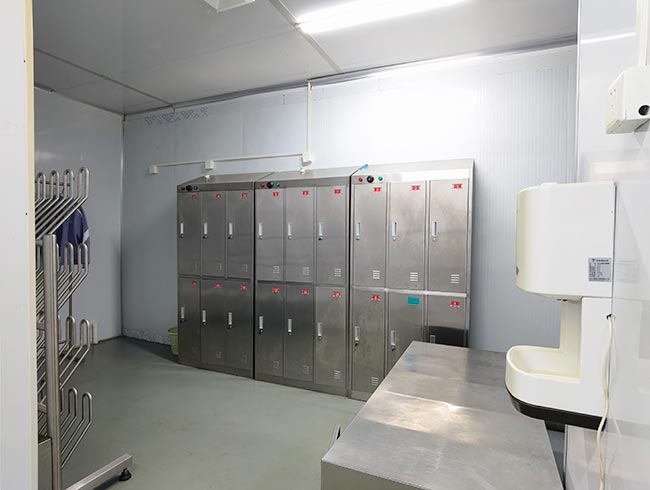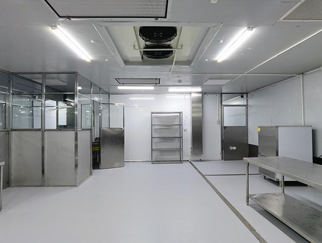 车间位于二层,总面积850㎡,配有3个冷库共150㎡,冷热加工车间、设备区、消毒清洗区、仓储区、更衣间等功能分区齐全,水电、橱柜、消防等配套完善。