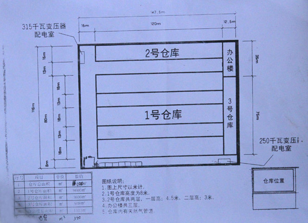 3号仓库面积938平方米,办公楼1313平方米,315千瓦变压器,配套齐全,水电齐全。